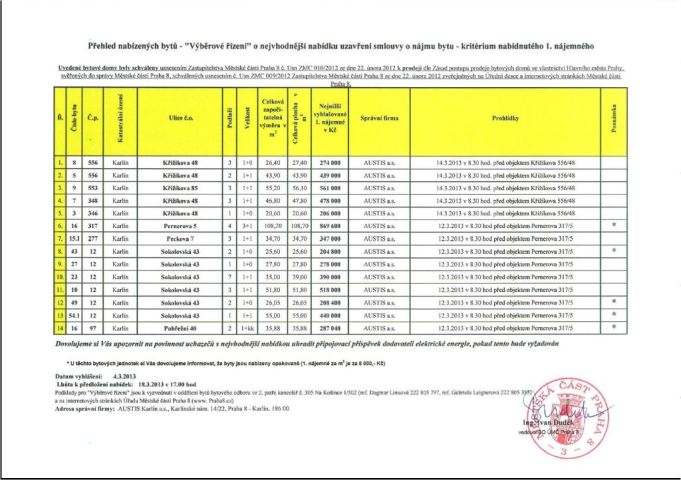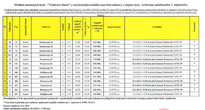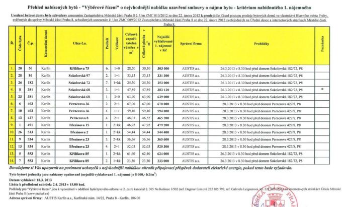 Výběrové řízení - nájem bytu č. 13,Pernerova 427/8